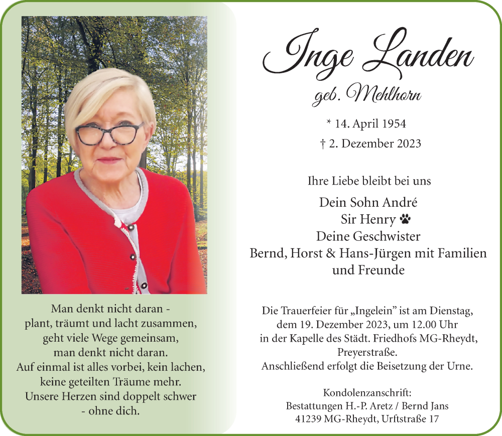 Hier finden Sie alle Traueranzeigen aus der Zeitung, die bisher für Inge Landen erschienen sind. Weitere Traueranzeigen, die in der Zeitung erscheinen, werden hier ebenfalls aufgelistet