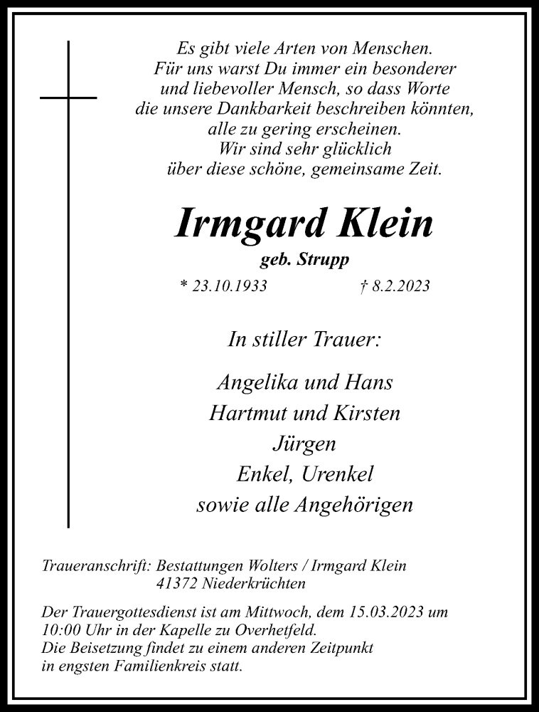 Hier finden Sie alle Traueranzeigen aus der Zeitung, die bisher für Irmgard Klein erschienen sind. Weitere Traueranzeigen, die in der Zeitung erscheinen, werden hier ebenfalls aufgelistet