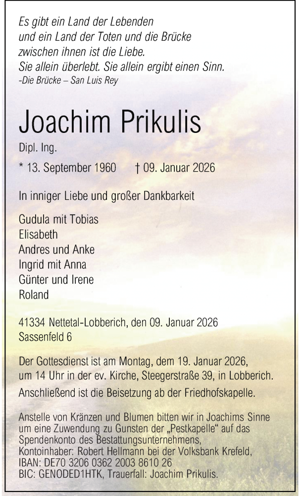 Hier finden Sie alle Traueranzeigen aus der Zeitung, die bisher für Joachim Prikulis erschienen sind. Weitere Traueranzeigen, die in der Zeitung erscheinen, werden hier ebenfalls aufgelistet