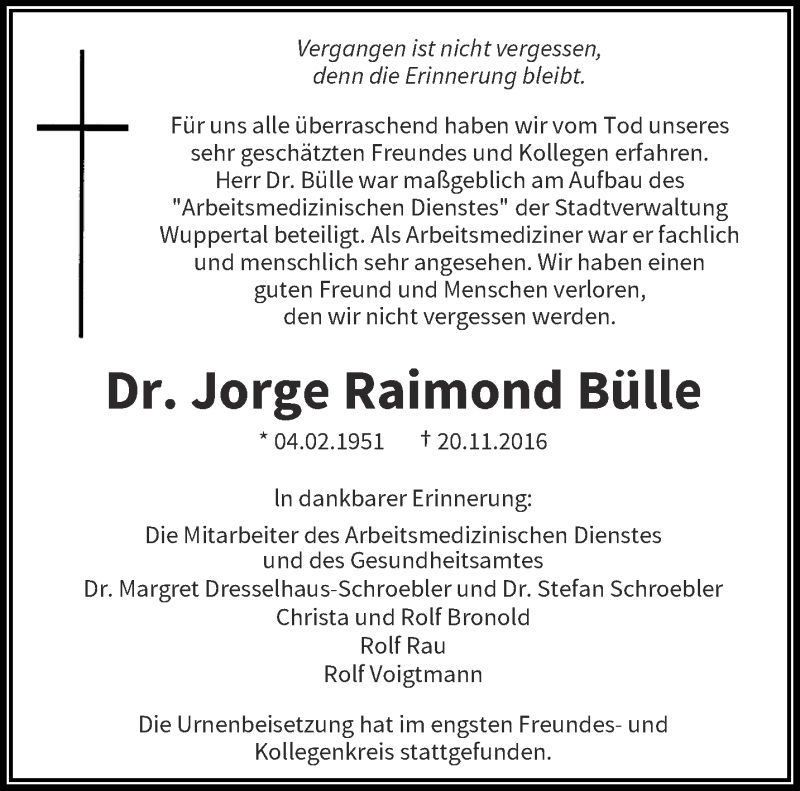 Hier finden Sie alle Traueranzeigen aus der Zeitung, die bisher für Jorge Raimond Bülle erschienen sind. Weitere Traueranzeigen, die in der Zeitung erscheinen, werden hier ebenfalls aufgelistet