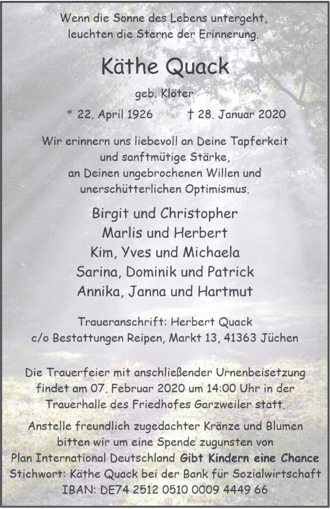 Hier finden Sie alle Traueranzeigen aus der Zeitung, die bisher für Käthe Quack erschienen sind. Weitere Traueranzeigen, die in der Zeitung erscheinen, werden hier ebenfalls aufgelistet