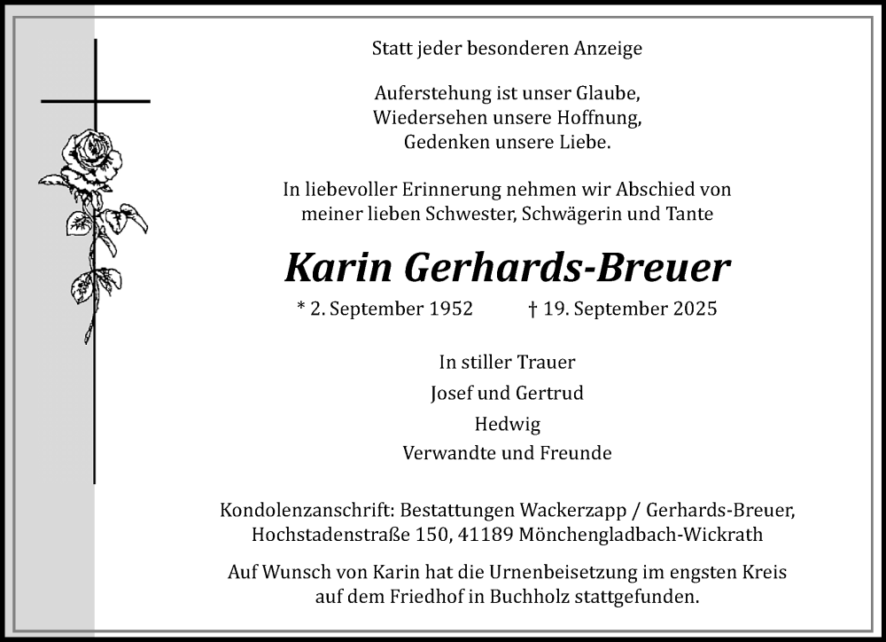 Hier finden Sie alle Traueranzeigen aus der Zeitung, die bisher für Karin Gerhards-Breuer erschienen sind. Weitere Traueranzeigen, die in der Zeitung erscheinen, werden hier ebenfalls aufgelistet