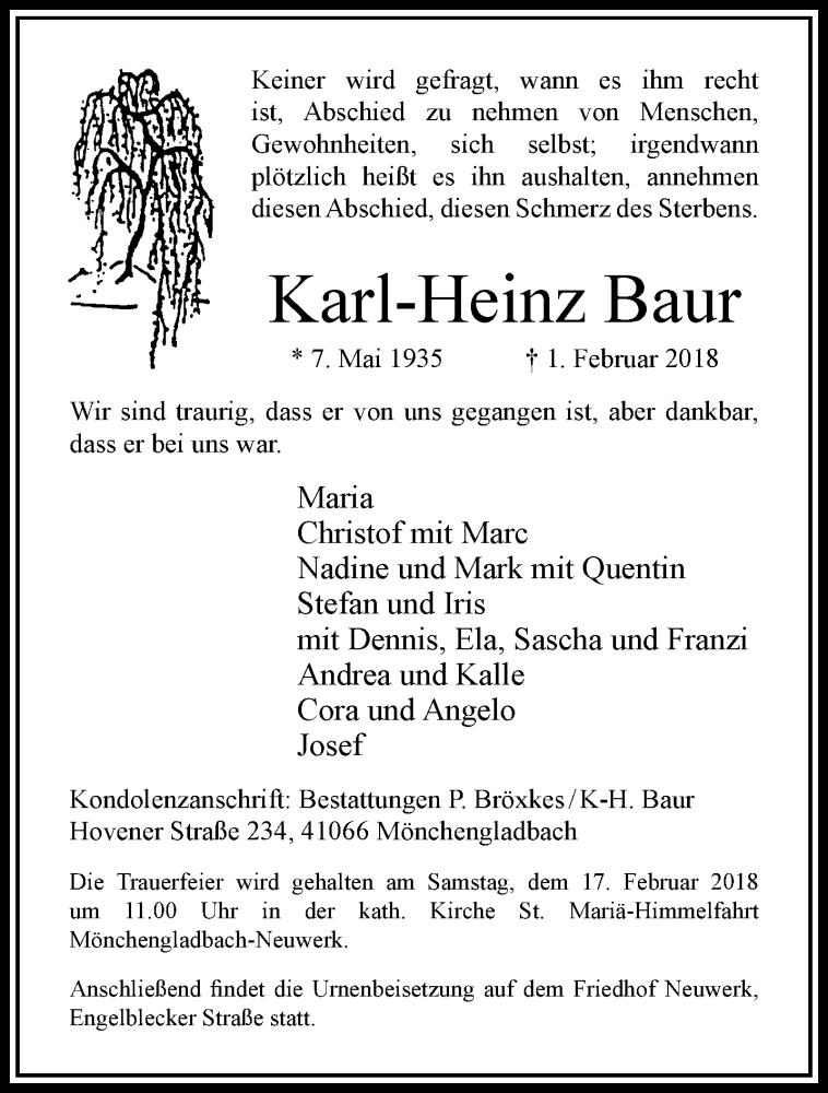 Hier finden Sie alle Traueranzeigen aus der Zeitung, die bisher für Karl-Heinz Baur erschienen sind. Weitere Traueranzeigen, die in der Zeitung erscheinen, werden hier ebenfalls aufgelistet