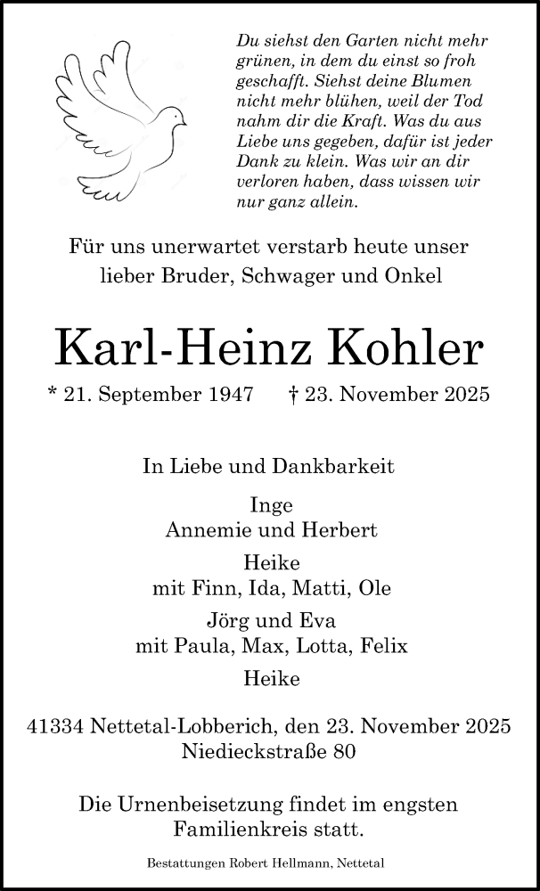 Hier finden Sie alle Traueranzeigen aus der Zeitung, die bisher für Karl-Heinz Kohler erschienen sind. Weitere Traueranzeigen, die in der Zeitung erscheinen, werden hier ebenfalls aufgelistet