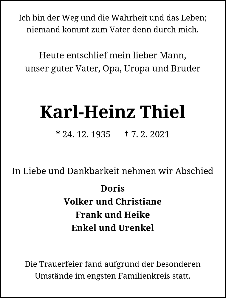 Hier finden Sie alle Traueranzeigen aus der Zeitung, die bisher für Karl-Heinz Thiel erschienen sind. Weitere Traueranzeigen, die in der Zeitung erscheinen, werden hier ebenfalls aufgelistet