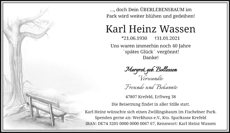 Hier finden Sie alle Traueranzeigen aus der Zeitung, die bisher für Karl Heinz Wassen erschienen sind. Weitere Traueranzeigen, die in der Zeitung erscheinen, werden hier ebenfalls aufgelistet
