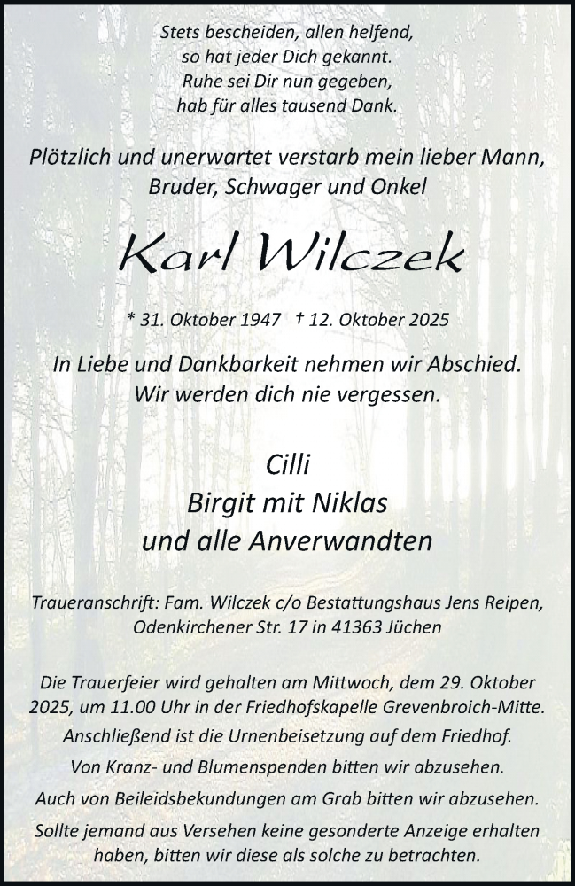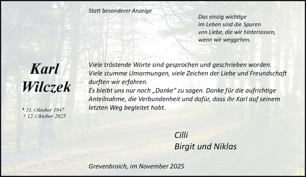 Hier finden Sie alle Traueranzeigen aus der Zeitung, die bisher für Karl Wilczek erschienen sind. Weitere Traueranzeigen, die in der Zeitung erscheinen, werden hier ebenfalls aufgelistet