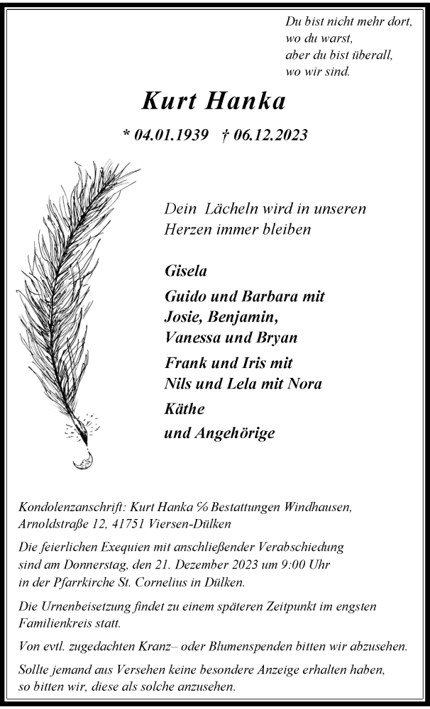 Hier finden Sie alle Traueranzeigen aus der Zeitung, die bisher für Kurt Hanka erschienen sind. Weitere Traueranzeigen, die in der Zeitung erscheinen, werden hier ebenfalls aufgelistet