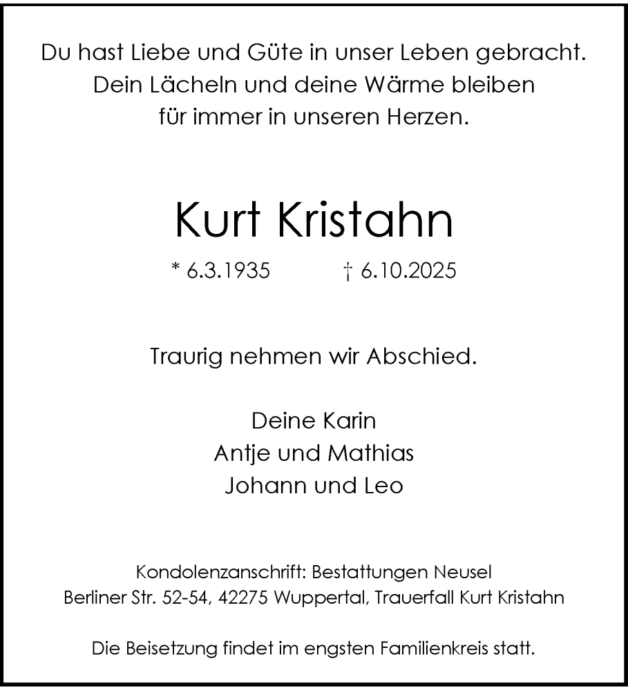 Hier finden Sie alle Traueranzeigen aus der Zeitung, die bisher für Kurt Kristahn erschienen sind. Weitere Traueranzeigen, die in der Zeitung erscheinen, werden hier ebenfalls aufgelistet