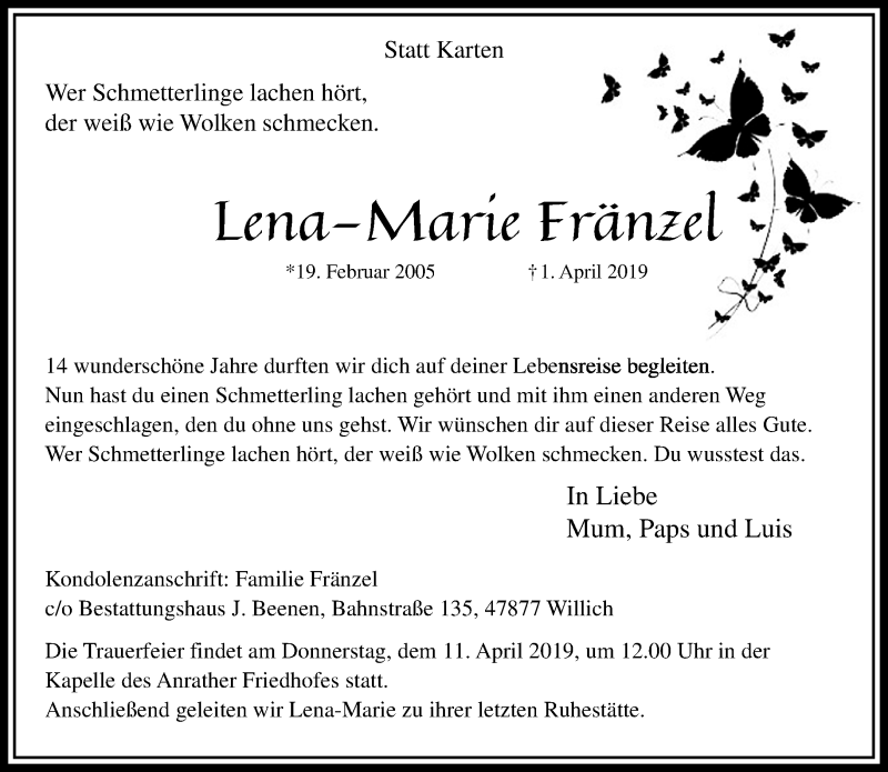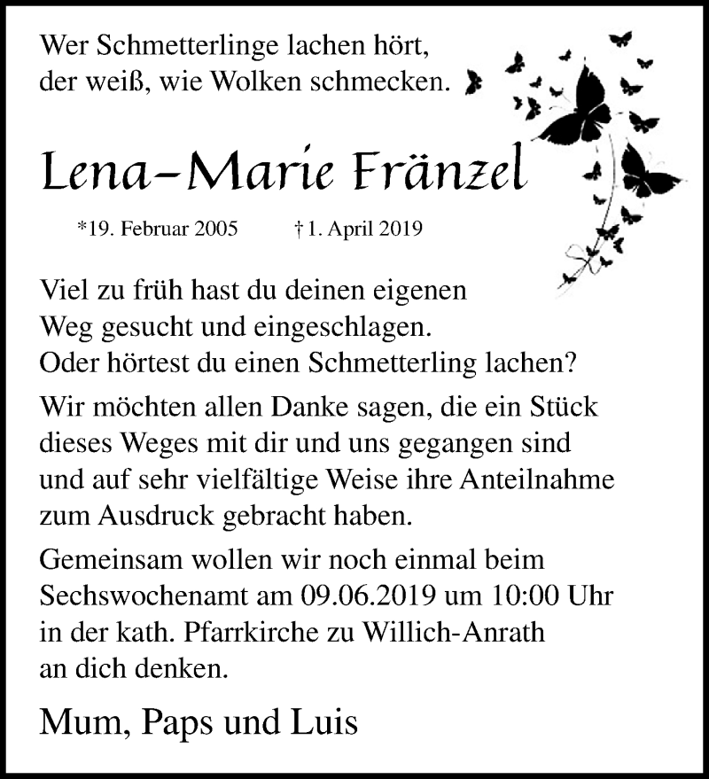 Hier finden Sie alle Traueranzeigen aus der Zeitung, die bisher für Lena-Marie Fränzel erschienen sind. Weitere Traueranzeigen, die in der Zeitung erscheinen, werden hier ebenfalls aufgelistet