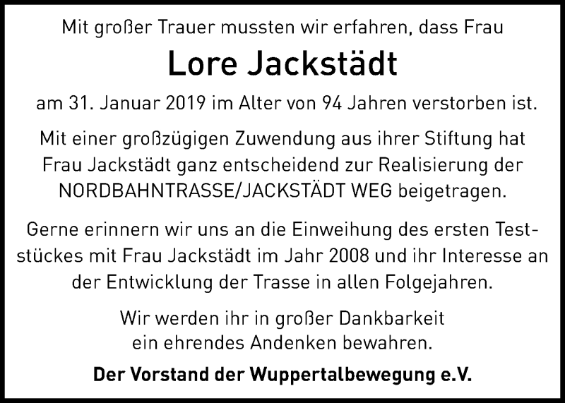 Hier finden Sie alle Traueranzeigen aus der Zeitung, die bisher für Lore Jackstädt erschienen sind. Weitere Traueranzeigen, die in der Zeitung erscheinen, werden hier ebenfalls aufgelistet