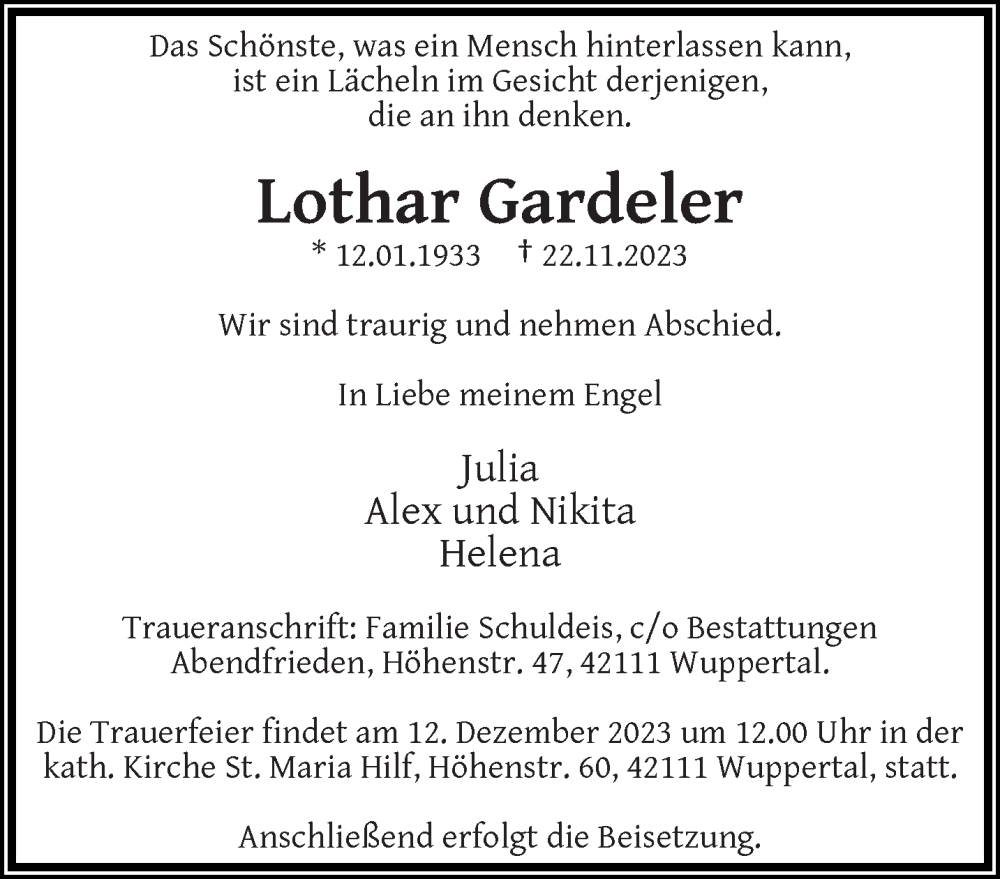 Hier finden Sie alle Traueranzeigen aus der Zeitung, die bisher für Lothar Gardeler erschienen sind. Weitere Traueranzeigen, die in der Zeitung erscheinen, werden hier ebenfalls aufgelistet