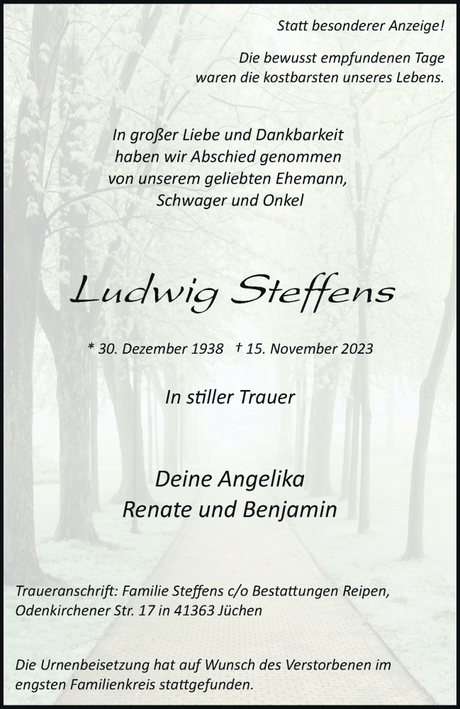 Hier finden Sie alle Traueranzeigen aus der Zeitung, die bisher für Ludwig Steffens erschienen sind. Weitere Traueranzeigen, die in der Zeitung erscheinen, werden hier ebenfalls aufgelistet