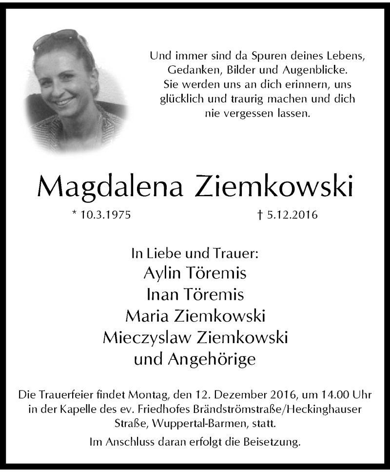 Hier finden Sie alle Traueranzeigen aus der Zeitung, die bisher für Magdalena Ziemkowski erschienen sind. Weitere Traueranzeigen, die in der Zeitung erscheinen, werden hier ebenfalls aufgelistet