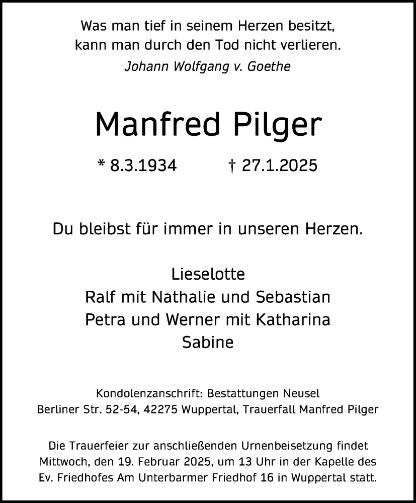 Hier finden Sie alle Traueranzeigen aus der Zeitung, die bisher für Manfred Pilger erschienen sind. Weitere Traueranzeigen, die in der Zeitung erscheinen, werden hier ebenfalls aufgelistet