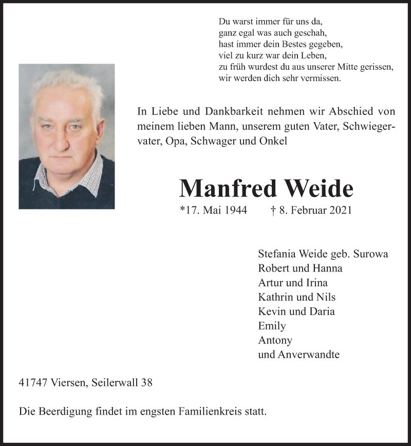Hier finden Sie alle Traueranzeigen aus der Zeitung, die bisher für Manfred Weide erschienen sind. Weitere Traueranzeigen, die in der Zeitung erscheinen, werden hier ebenfalls aufgelistet