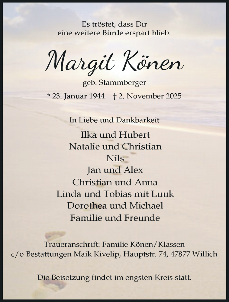 Hier finden Sie alle Traueranzeigen aus der Zeitung, die bisher für Margit Könen erschienen sind. Weitere Traueranzeigen, die in der Zeitung erscheinen, werden hier ebenfalls aufgelistet