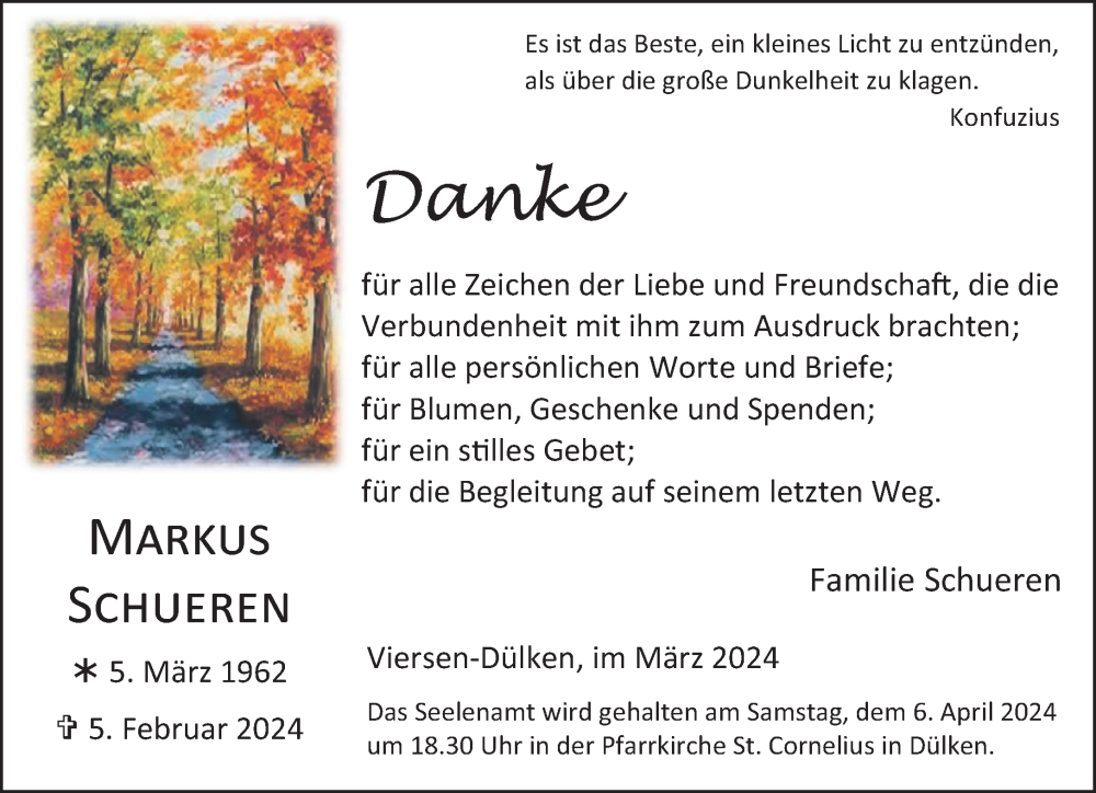 Hier finden Sie alle Traueranzeigen aus der Zeitung, die bisher für Markus Schueren erschienen sind. Weitere Traueranzeigen, die in der Zeitung erscheinen, werden hier ebenfalls aufgelistet