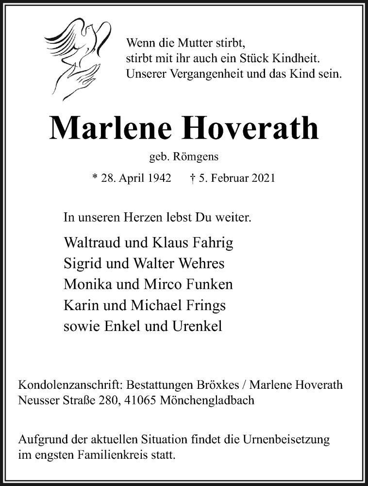 Hier finden Sie alle Traueranzeigen aus der Zeitung, die bisher für Marlene Hoverath erschienen sind. Weitere Traueranzeigen, die in der Zeitung erscheinen, werden hier ebenfalls aufgelistet