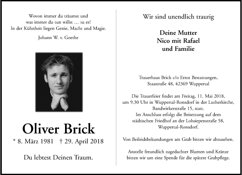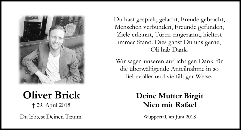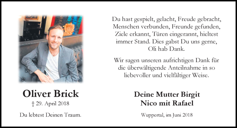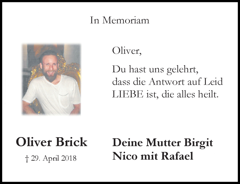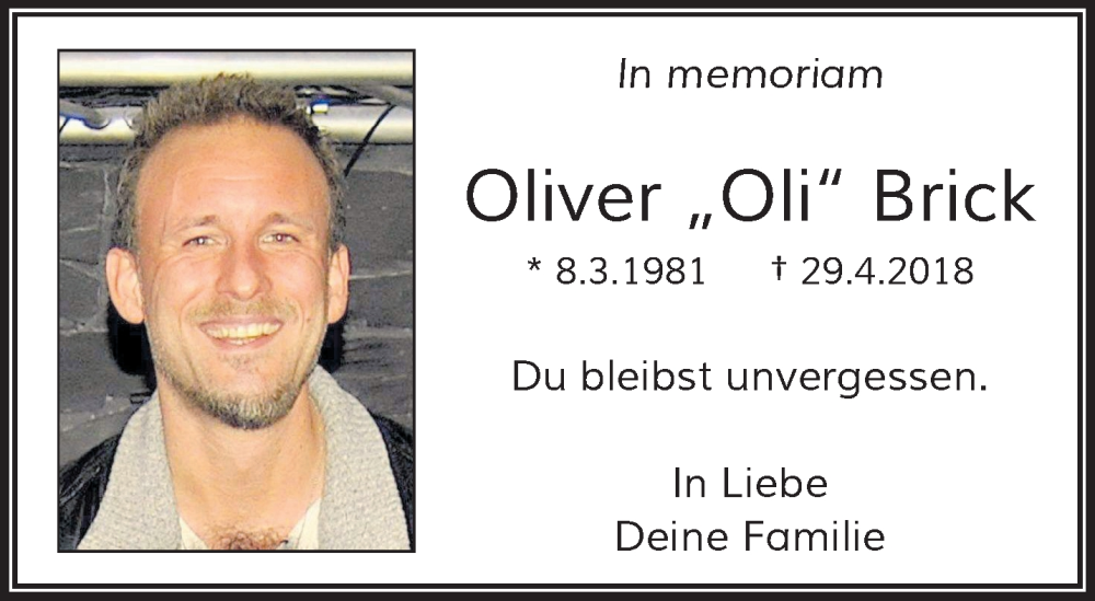 Hier finden Sie alle Traueranzeigen aus der Zeitung, die bisher für Oliver Brick erschienen sind. Weitere Traueranzeigen, die in der Zeitung erscheinen, werden hier ebenfalls aufgelistet