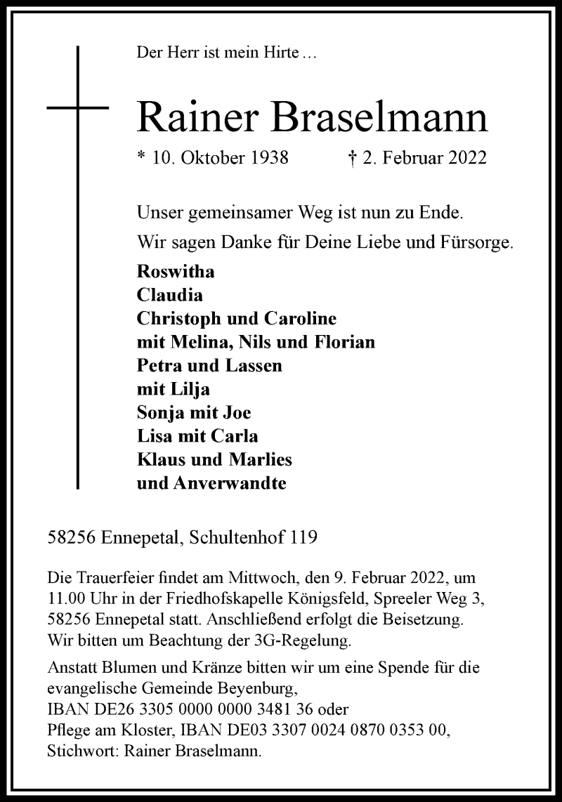Hier finden Sie alle Traueranzeigen aus der Zeitung, die bisher für Rainer Braselmann erschienen sind. Weitere Traueranzeigen, die in der Zeitung erscheinen, werden hier ebenfalls aufgelistet