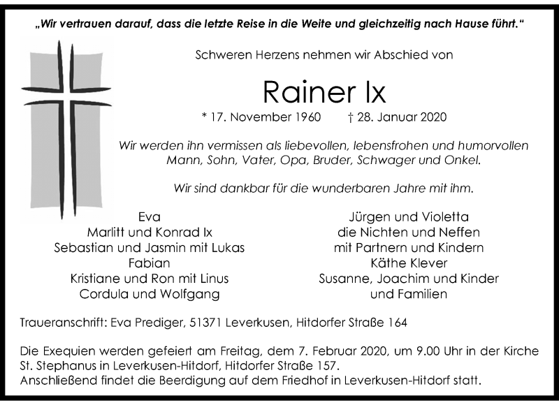 Hier finden Sie alle Traueranzeigen aus der Zeitung, die bisher für Rainer Ix erschienen sind. Weitere Traueranzeigen, die in der Zeitung erscheinen, werden hier ebenfalls aufgelistet