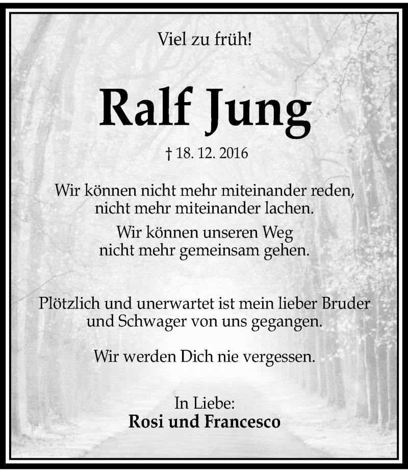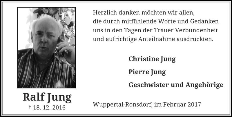 Hier finden Sie alle Traueranzeigen aus der Zeitung, die bisher für Ralf Jung erschienen sind. Weitere Traueranzeigen, die in der Zeitung erscheinen, werden hier ebenfalls aufgelistet