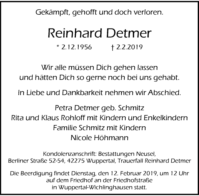 Hier finden Sie alle Traueranzeigen aus der Zeitung, die bisher für Reinhard Detmer erschienen sind. Weitere Traueranzeigen, die in der Zeitung erscheinen, werden hier ebenfalls aufgelistet