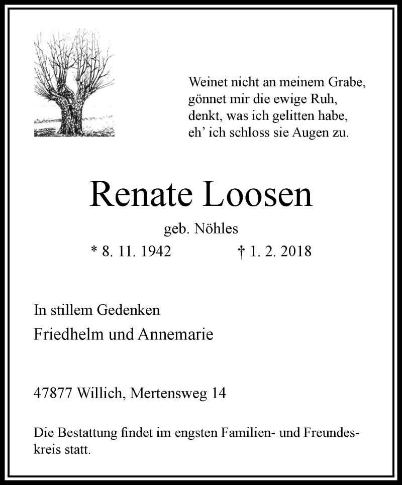 Hier finden Sie alle Traueranzeigen aus der Zeitung, die bisher für Renate Loosen erschienen sind. Weitere Traueranzeigen, die in der Zeitung erscheinen, werden hier ebenfalls aufgelistet