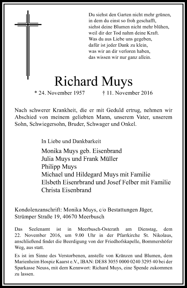 Hier finden Sie alle Traueranzeigen aus der Zeitung, die bisher für Richard Muys erschienen sind. Weitere Traueranzeigen, die in der Zeitung erscheinen, werden hier ebenfalls aufgelistet