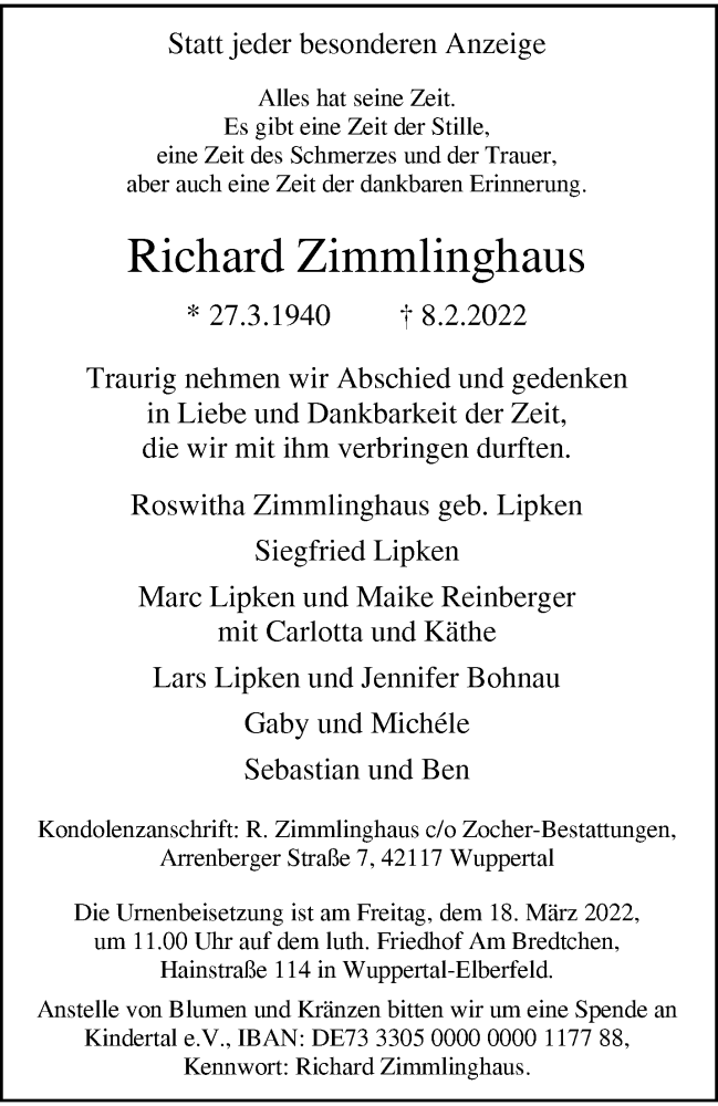 Hier finden Sie alle Traueranzeigen aus der Zeitung, die bisher für Richard Zimmlinghaus erschienen sind. Weitere Traueranzeigen, die in der Zeitung erscheinen, werden hier ebenfalls aufgelistet