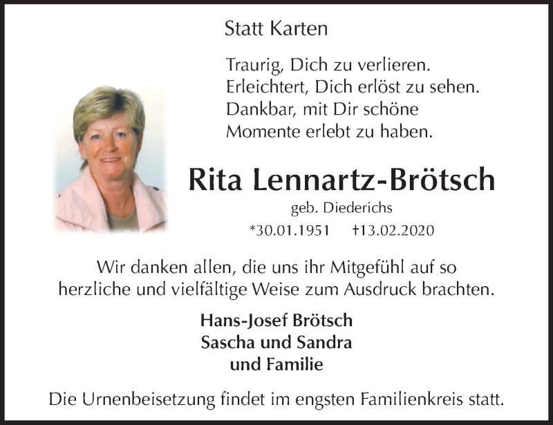 Hier finden Sie alle Traueranzeigen aus der Zeitung, die bisher für Rita Lennartz-Brötsch erschienen sind. Weitere Traueranzeigen, die in der Zeitung erscheinen, werden hier ebenfalls aufgelistet