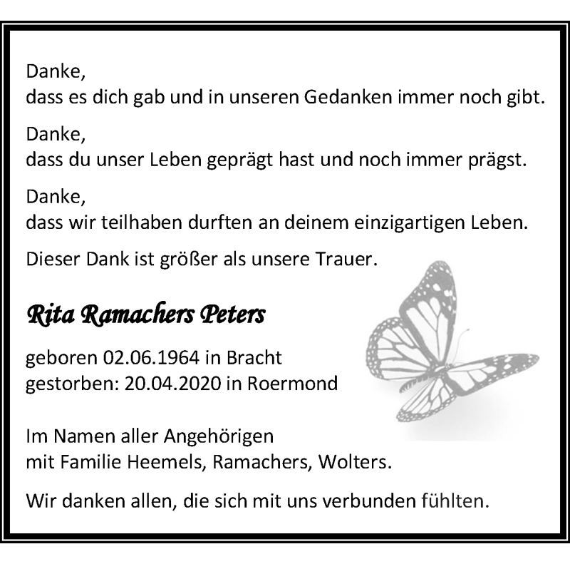Hier finden Sie alle Traueranzeigen aus der Zeitung, die bisher für Rita Ramachers Peters erschienen sind. Weitere Traueranzeigen, die in der Zeitung erscheinen, werden hier ebenfalls aufgelistet