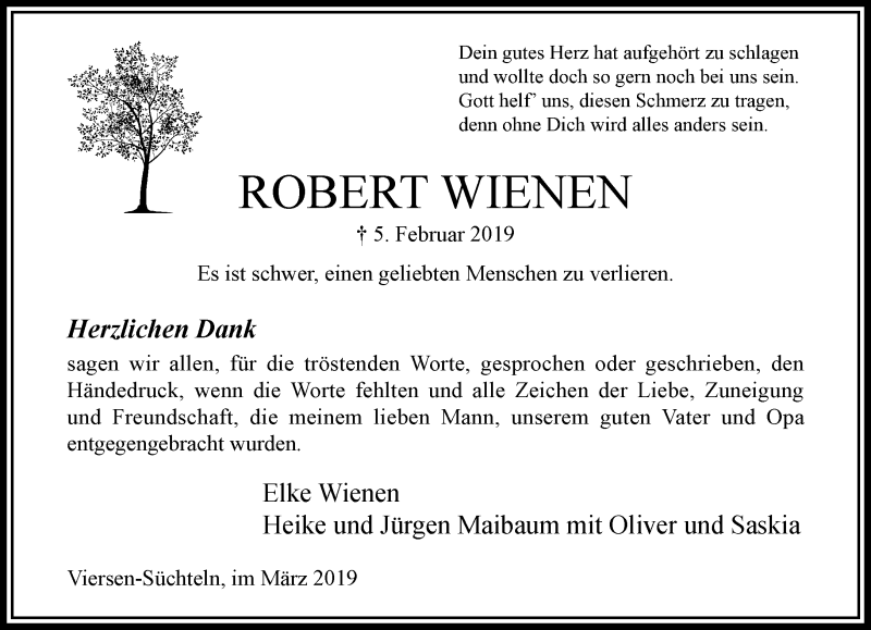 Hier finden Sie alle Traueranzeigen aus der Zeitung, die bisher für Robert Wienen erschienen sind. Weitere Traueranzeigen, die in der Zeitung erscheinen, werden hier ebenfalls aufgelistet