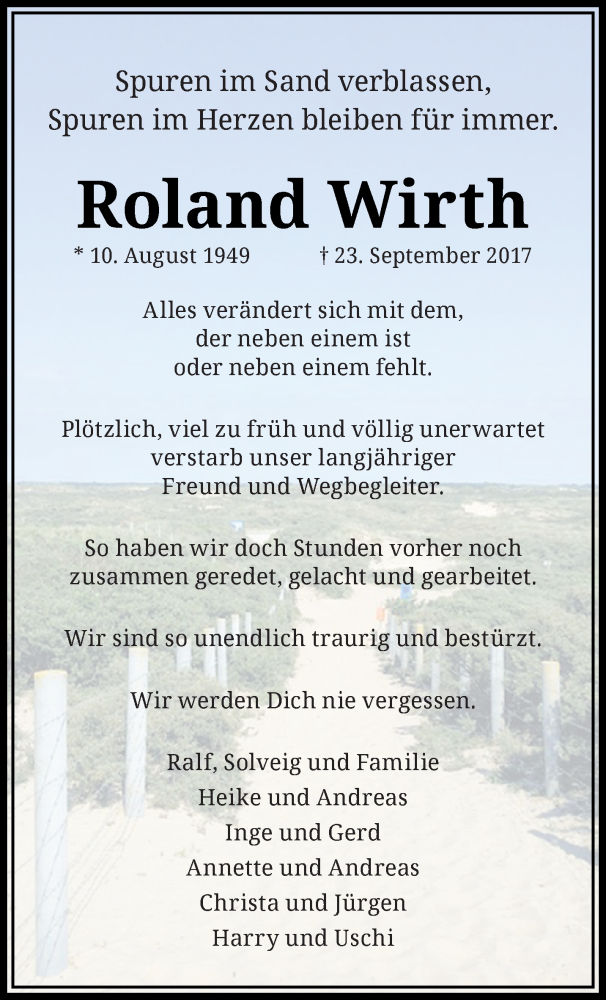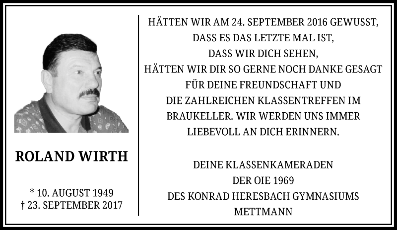 Hier finden Sie alle Traueranzeigen aus der Zeitung, die bisher für Roland Wirth erschienen sind. Weitere Traueranzeigen, die in der Zeitung erscheinen, werden hier ebenfalls aufgelistet