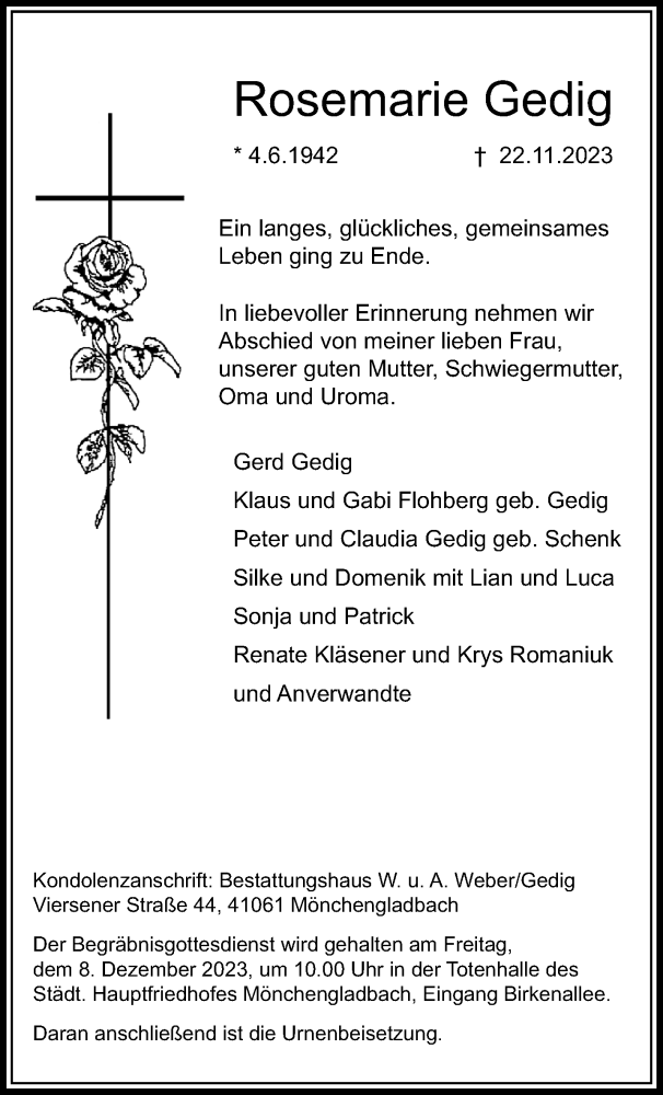 Hier finden Sie alle Traueranzeigen aus der Zeitung, die bisher für Rosemarie Gedig erschienen sind. Weitere Traueranzeigen, die in der Zeitung erscheinen, werden hier ebenfalls aufgelistet