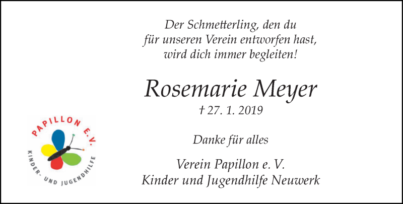 Hier finden Sie alle Traueranzeigen aus der Zeitung, die bisher für Rosemarie Meyer erschienen sind. Weitere Traueranzeigen, die in der Zeitung erscheinen, werden hier ebenfalls aufgelistet