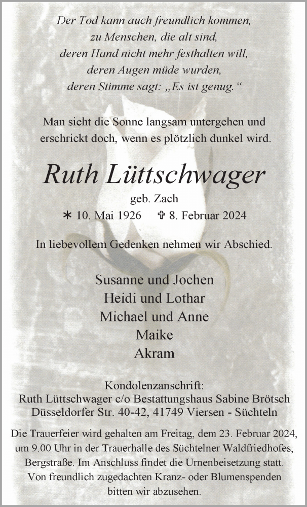 Hier finden Sie alle Traueranzeigen aus der Zeitung, die bisher für Ruth Lüttschwager erschienen sind. Weitere Traueranzeigen, die in der Zeitung erscheinen, werden hier ebenfalls aufgelistet