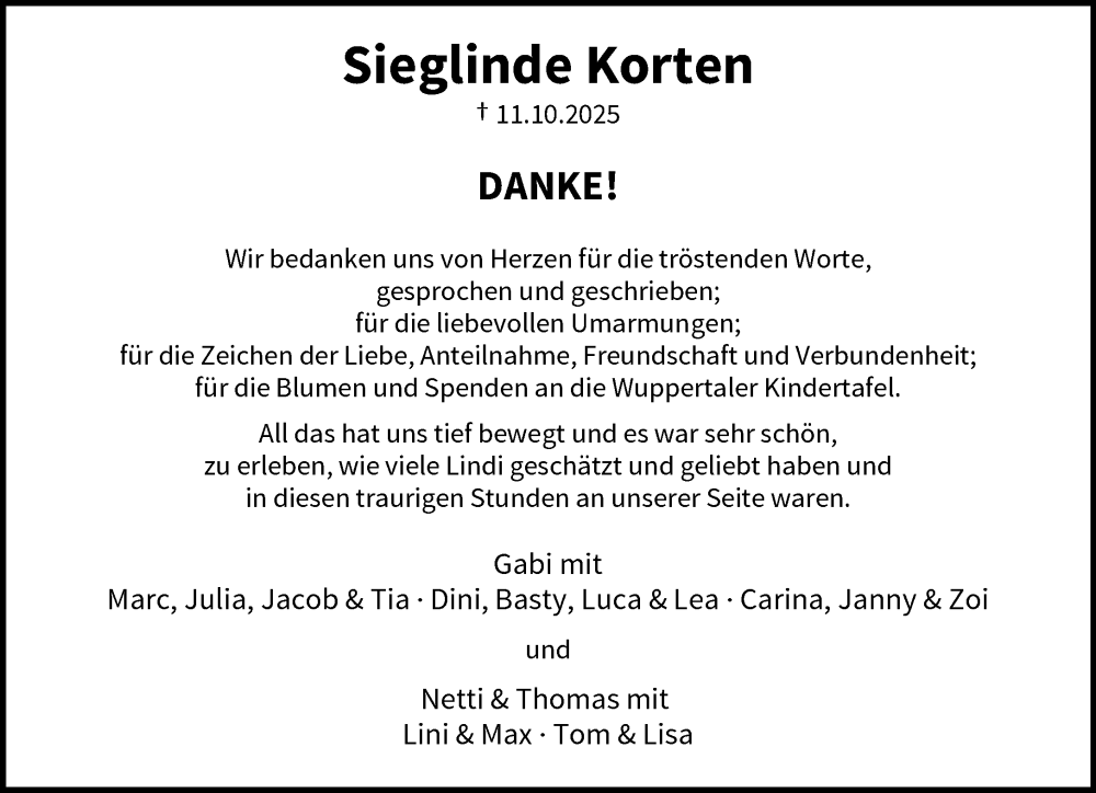 Hier finden Sie alle Traueranzeigen aus der Zeitung, die bisher für Sieglinde Korten erschienen sind. Weitere Traueranzeigen, die in der Zeitung erscheinen, werden hier ebenfalls aufgelistet
