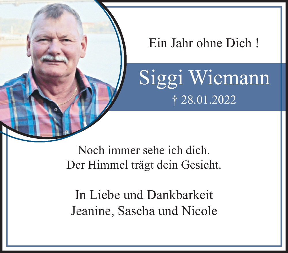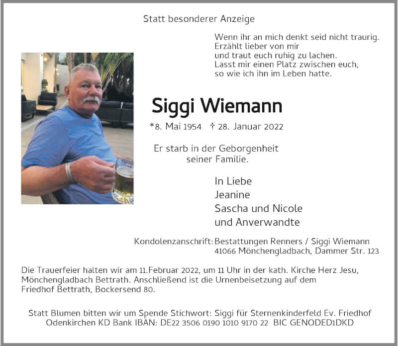 Hier finden Sie alle Traueranzeigen aus der Zeitung, die bisher für Siggi Wiemann erschienen sind. Weitere Traueranzeigen, die in der Zeitung erscheinen, werden hier ebenfalls aufgelistet
