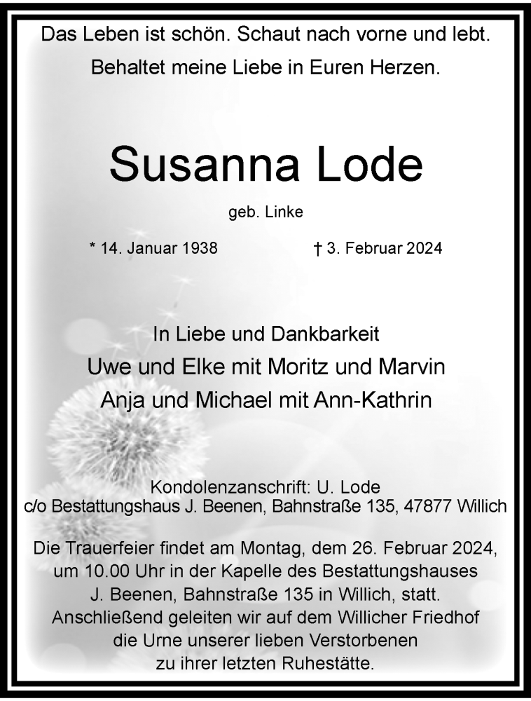 Hier finden Sie alle Traueranzeigen aus der Zeitung, die bisher für Susanna Lode erschienen sind. Weitere Traueranzeigen, die in der Zeitung erscheinen, werden hier ebenfalls aufgelistet