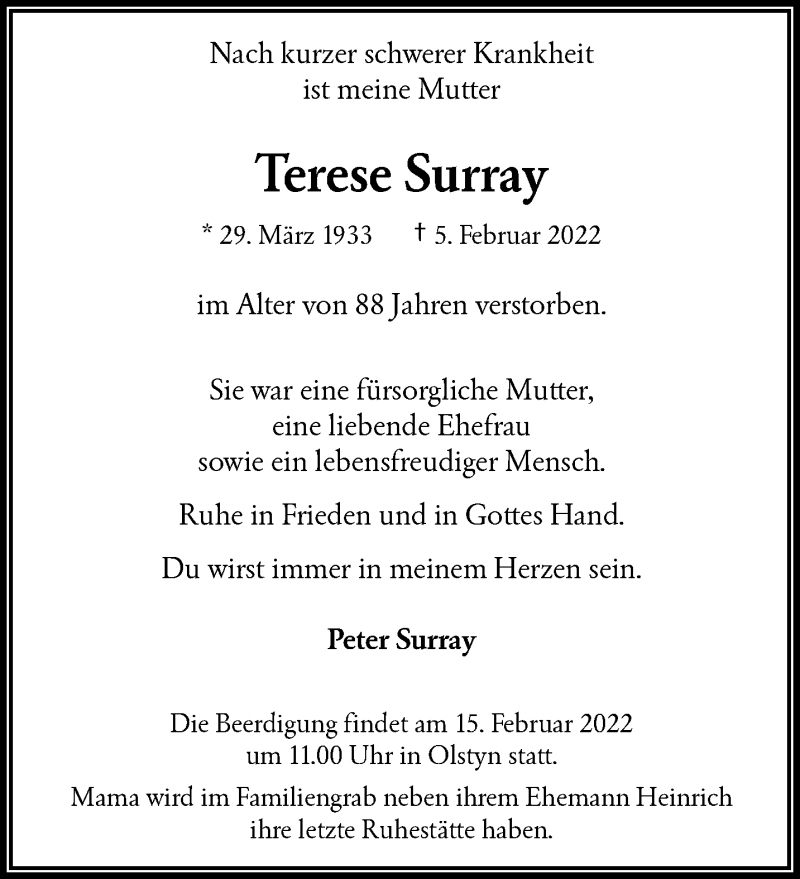 Hier finden Sie alle Traueranzeigen aus der Zeitung, die bisher für Terese Surray erschienen sind. Weitere Traueranzeigen, die in der Zeitung erscheinen, werden hier ebenfalls aufgelistet