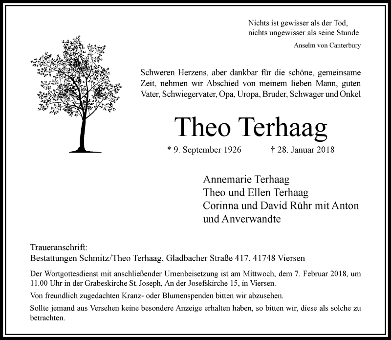 Hier finden Sie alle Traueranzeigen aus der Zeitung, die bisher für Theo Terhaag erschienen sind. Weitere Traueranzeigen, die in der Zeitung erscheinen, werden hier ebenfalls aufgelistet