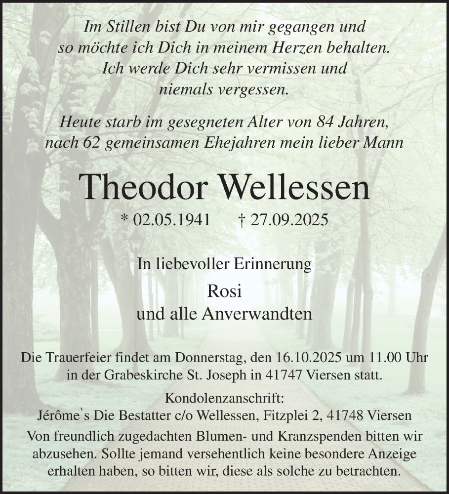 Hier finden Sie alle Traueranzeigen aus der Zeitung, die bisher für Theodor Wellessen erschienen sind. Weitere Traueranzeigen, die in der Zeitung erscheinen, werden hier ebenfalls aufgelistet