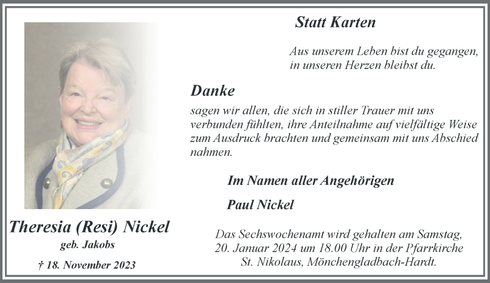 Hier finden Sie alle Traueranzeigen aus der Zeitung, die bisher für Theresia Nickel erschienen sind. Weitere Traueranzeigen, die in der Zeitung erscheinen, werden hier ebenfalls aufgelistet