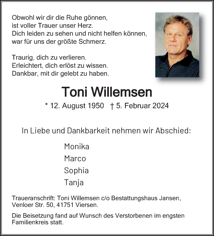 Hier finden Sie alle Traueranzeigen aus der Zeitung, die bisher für Toni Willemsen erschienen sind. Weitere Traueranzeigen, die in der Zeitung erscheinen, werden hier ebenfalls aufgelistet