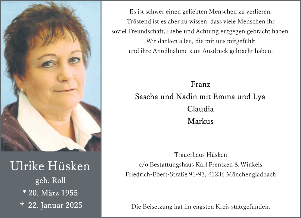 Hier finden Sie alle Traueranzeigen aus der Zeitung, die bisher für Ulrike Hüsken erschienen sind. Weitere Traueranzeigen, die in der Zeitung erscheinen, werden hier ebenfalls aufgelistet