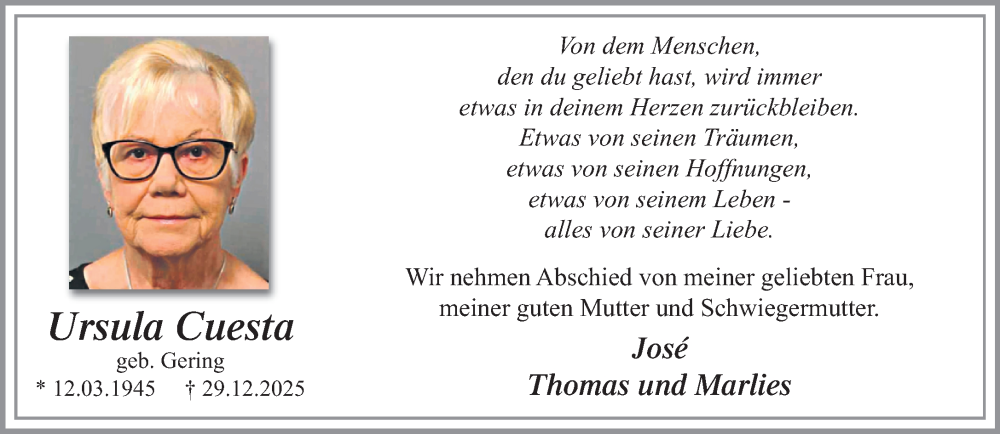 Hier finden Sie alle Traueranzeigen aus der Zeitung, die bisher für Ursula Cuesta erschienen sind. Weitere Traueranzeigen, die in der Zeitung erscheinen, werden hier ebenfalls aufgelistet