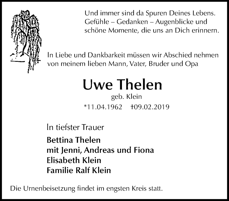 Hier finden Sie alle Traueranzeigen aus der Zeitung, die bisher für Uwe Thelen erschienen sind. Weitere Traueranzeigen, die in der Zeitung erscheinen, werden hier ebenfalls aufgelistet