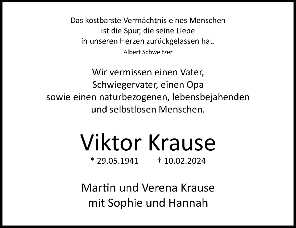 Hier finden Sie alle Traueranzeigen aus der Zeitung, die bisher für Viktor Krause erschienen sind. Weitere Traueranzeigen, die in der Zeitung erscheinen, werden hier ebenfalls aufgelistet